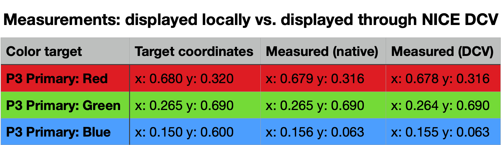 - With the configuration and hardware discussed above, no measurable shift in P3 primary chromaticities/luminance compared to baseline could be detected.